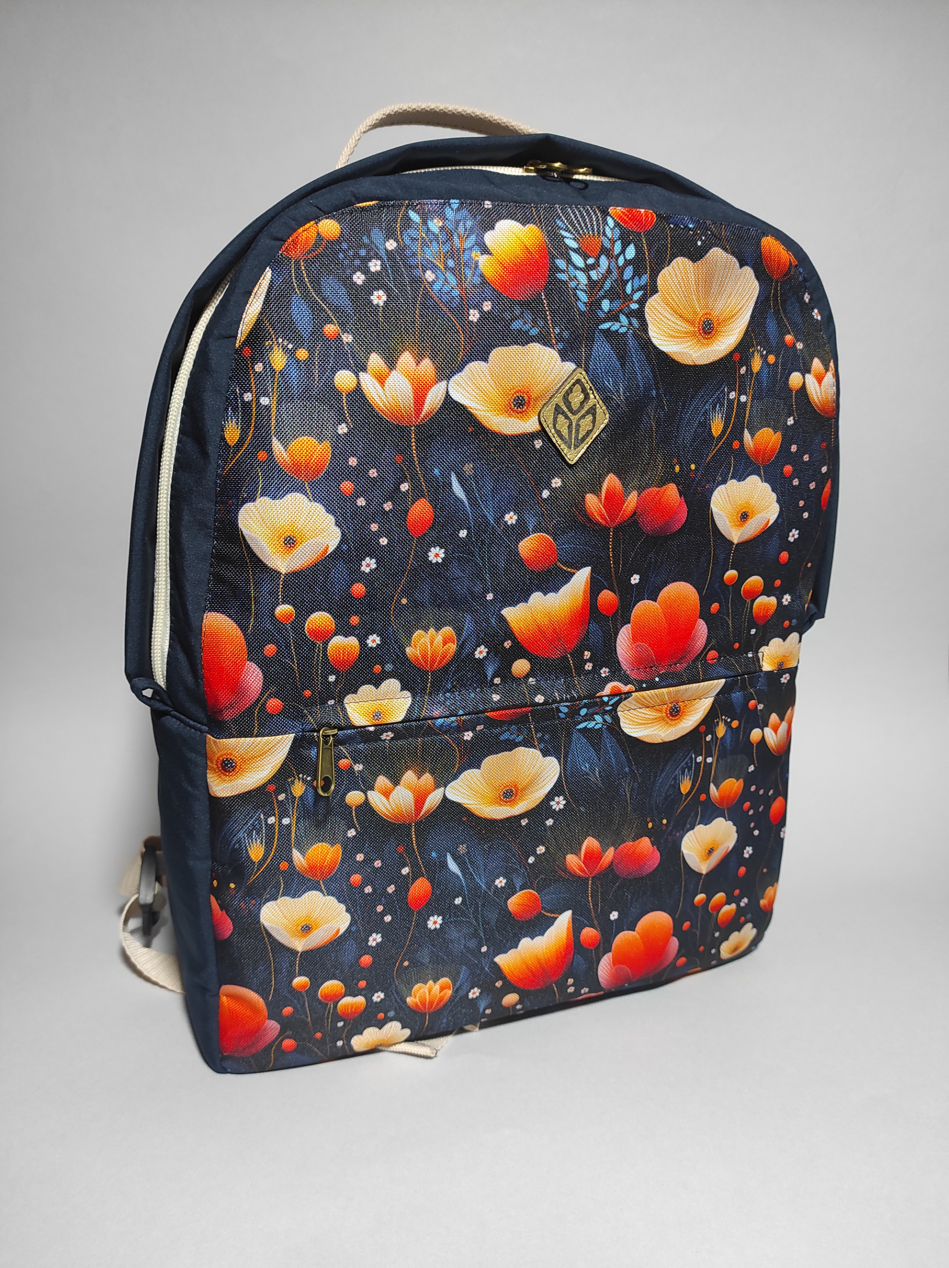 Vízlepergető anyagból készűlt, mintás elülső résszel rendelkező nagy női hátizsák.